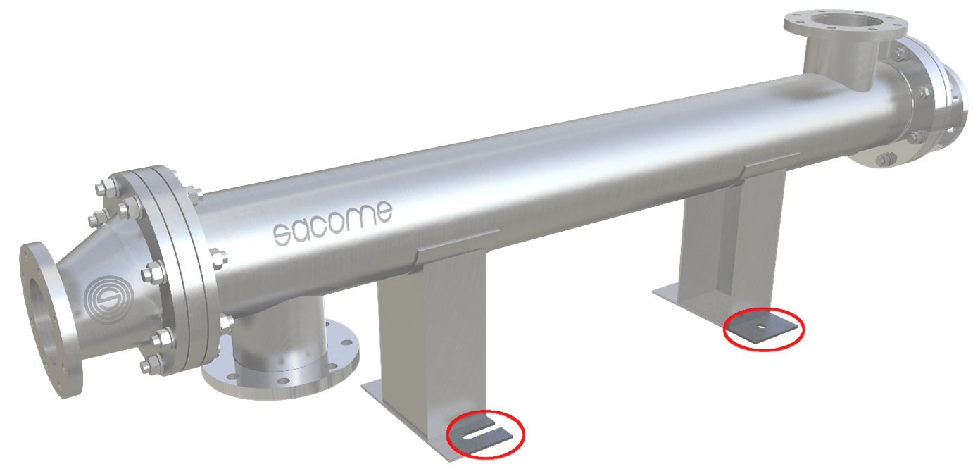 Depending on the disposition of the equipment (horizontal, vertical installation, one or several modules in series, etc.), the heat exchanger may be supported on the foundation in various ways. For example, in the case of a single module with horizontal layout, it can be supported on 2 cradles or support legs, as shown in Figure 8. If the anchor bolts are anchored to the floor in such a way that they do not allow movement of the equipment, there will be additional stresses in the expansion joint as well as in the tube-to-tubesheet weldings, thus leading to cracking in the welds. With this in mind, if the heat exchanger is fixed at 2 points, it is advisable to leave one of them sliding or allowing free expansion. In many projects the support or frame is part of the scope of supply, in which case this type of construction detail must be taken into account. However, if this is not the case and the customer decides to construct it themselves, it is essential that the installation company in charge of the frame take this type of detail into account, in order to avoid additional stresses (and possible breakage) in the equipment.