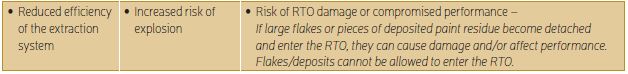 The exhaust system is equipped with high performance fans, which generate high velocity air flows in the ductwork. Despite the air moving at high speed, paint residues are still deposited along the entire length of the ductwork. Regular cleaning of the ducts will help to reduce or negate the impact of these paint residue deposits shown in Table 1.
