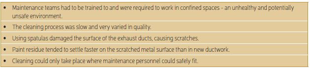 In the past, cleaning was carried out manually; trained maintenance personnel entered and moved around inside the ducts scraping away the deposited material with spatulas. This critical maintenance work caused a range of associated problems as laid out in Table 2.