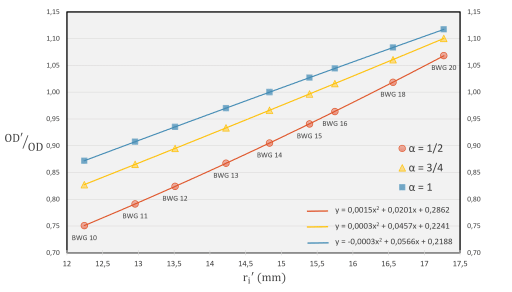 At this point, we are ready to delve into the impact of retubing in overdesign. We will consider three different values for α: 1/2, 3/4 and 1. Regarding the tube geometry, the outer radius will be ¾”. To model the real scenario, the values for the inner radius are consequently set with the Birmingham Wire Gauge (BWG) system [⁶]. Regarding the real case, BWG 14 is the value prior to retubing. In Figure 2 it can be clearly appreciated that, in the range of interest, the ratio in overdesign increases with ri’. With this representation, it can be easily appreciated how higher conductivities provide better heat transfer.
