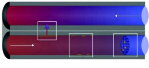 Computational flow dynamics (CFD) is a versatile tool, which have been widely used in fouling studies. CFD provides opportunities to study the physical interplay of surface stresses, flow velocity, and rheological properties. Figure 3 illustrates how mixing and transport processes could be understood through CFD in combination with results from experiments. CFD algorithm for heat exchanger systems must solve equations for mass transport, heat transfer, and chemical reactions in both the solution and on the surface, all while having a system that is evolving in time. Depending on the model’s complexity, multiple stages of the fouling process can be incorporated, ranging from complex nucleation schemes to temporal evolution of the properties of the fouling layers. Johansen and coworkers developed a model that aims to change how surface fouling is usually modelled.⁴ They challenge the popular two-step model, which calculates the transport to the surface and then the surface adsorption.